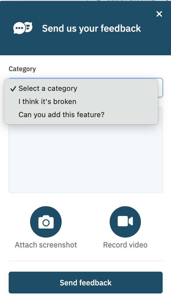 Select Give Feedback and a Category to tell us what your experiencing or a feature you would like to see included.