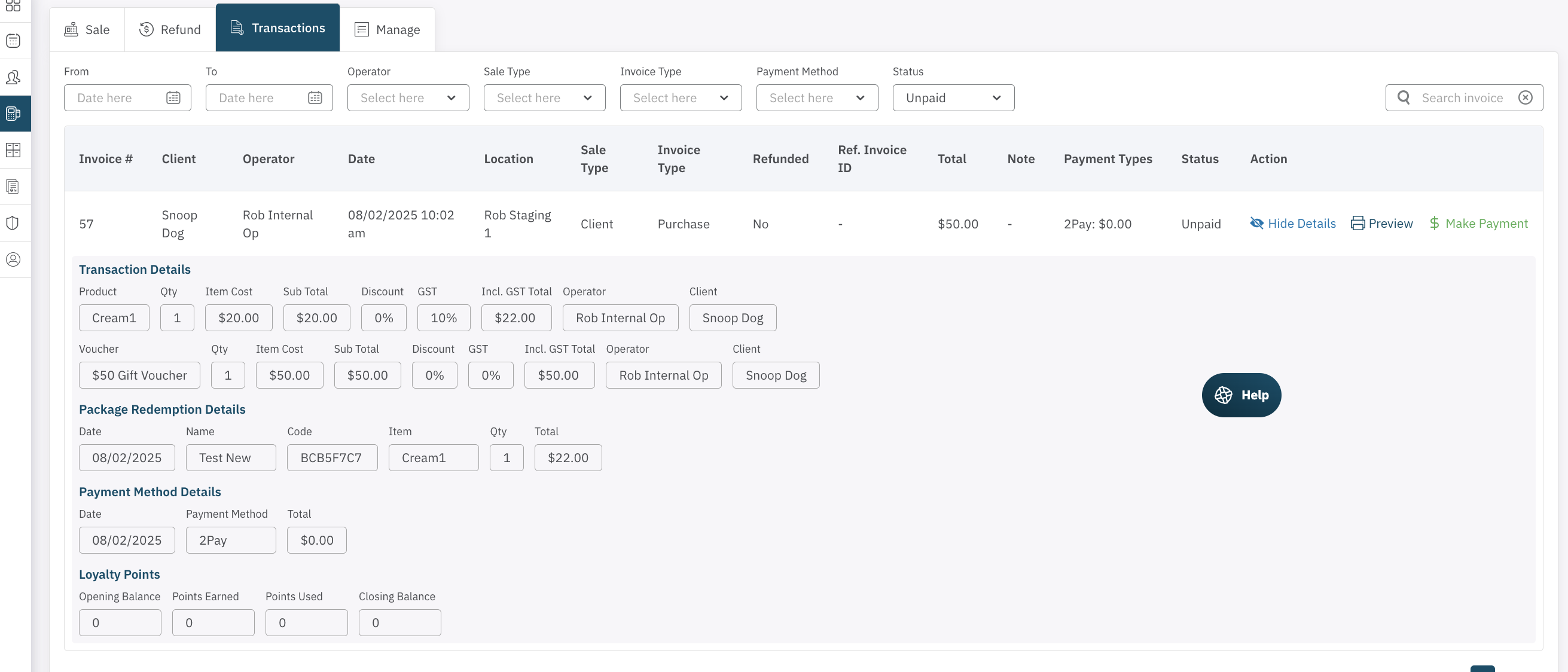 Access any transaction (refunds or payments), view a summary, preview the invoice, and if money is owed collect a payment.