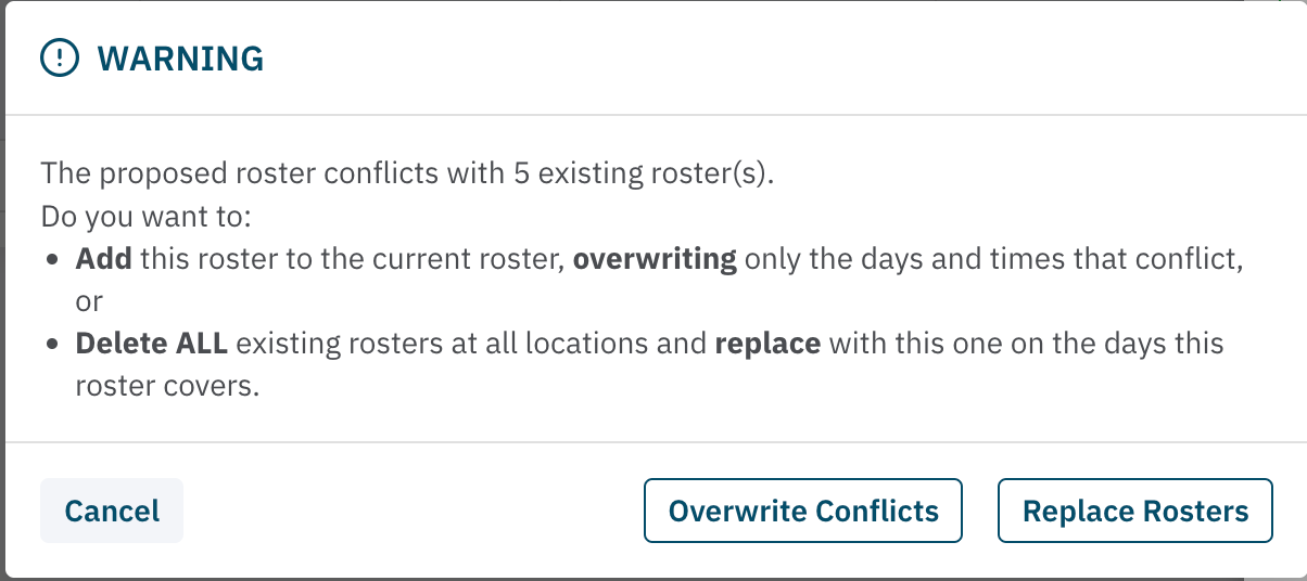 When setting up or adjusting rosters, the system will alert you to any conflicts that may arise. A warning will appear with options for how to resolve the conflict, along with explanations for each choice. It's important to carefully review the warning before proceeding to avoid unintentional changes to current schedules.