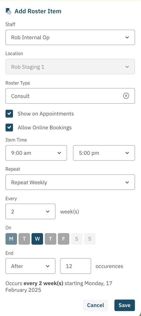 Note: Repeat occurrences cannot be edited directly once created; they are overwritten with a new roster item/series as reqired.