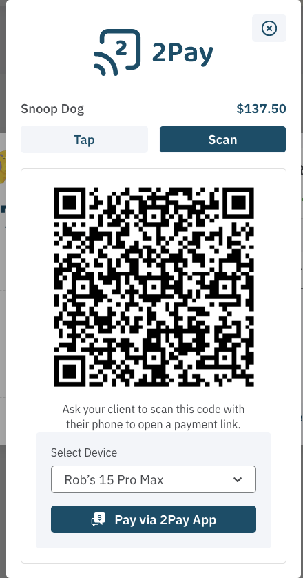 Make it even easier for your clients by letting them scan a QR code displayed on your computer or 2Pay app. The QR code opens a secure payment page on their device, where they can choose their preferred payment method—Apple Pay, credit/debit card, Afterpay, and more! It’s quick, convenient, and completely contactless.